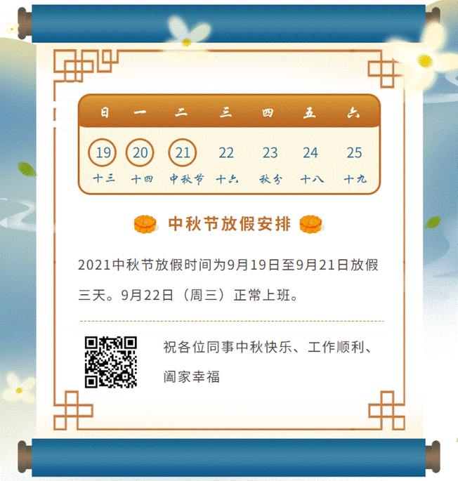 根据国家法定假日、结合公司情况,现将中秋节放假时间定为9月19日-21日,为期三天;节假日期间公司暂停加工和发货业务,由此给您带来不便敬请谅解!